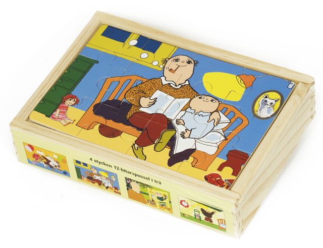 4 flotte puslespill i tre med 12 brikker i hvert av dem.