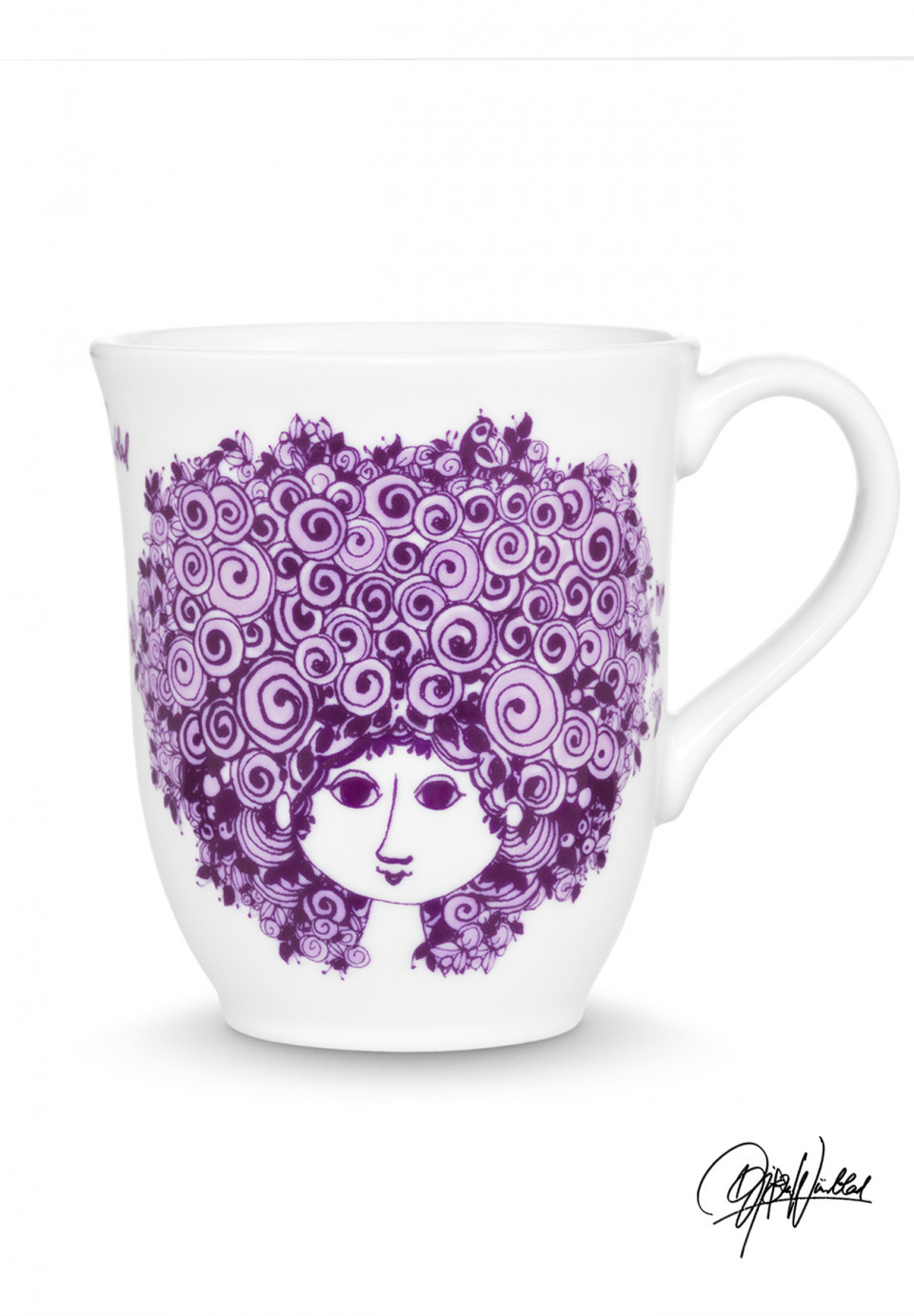 Få Bjørn Wiinblads eventyrlige og livsglade verden inn i ditt hjem. De vakre Wiinblad-krusene med hank har et dekorativt kvinneansikt med fine detaljer. Det lilla kvinneansiktet, som er Bjørn Wiinblads signaturmotiv, er applikert for hånd.