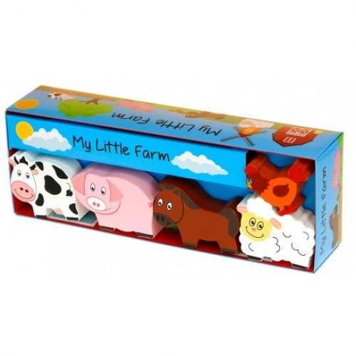 Dette er et koselig lekesett med fem dyr i tre; en sau, en gris, en ku, en hest og en høne. Esken kan du bruke som stall til bondegårdsdyrene. Dyrene er opptil 5 cm høye og 1,5 cm tykke.