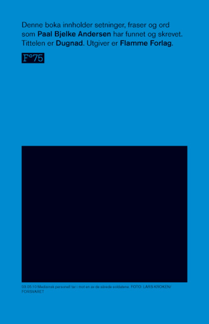 Dugnad er en dypt personlig, kollektivt skrevet bok om det norske blikket på verden anno 2010. Nederst på hver bokside løper billedtekster fra Aftenpostens Afghanistan-dekning. Over billedtekstene vil leseren finne bl.a. tre selvportretter, to kartlegginger av Oslos økonomiske geografi, to bearbeidelser av norske statsministertaler, et lyrisk dikt og en liste med afghanske og norske personnavn. Paal Bjelke Andersen (f. 1966) er debutant.