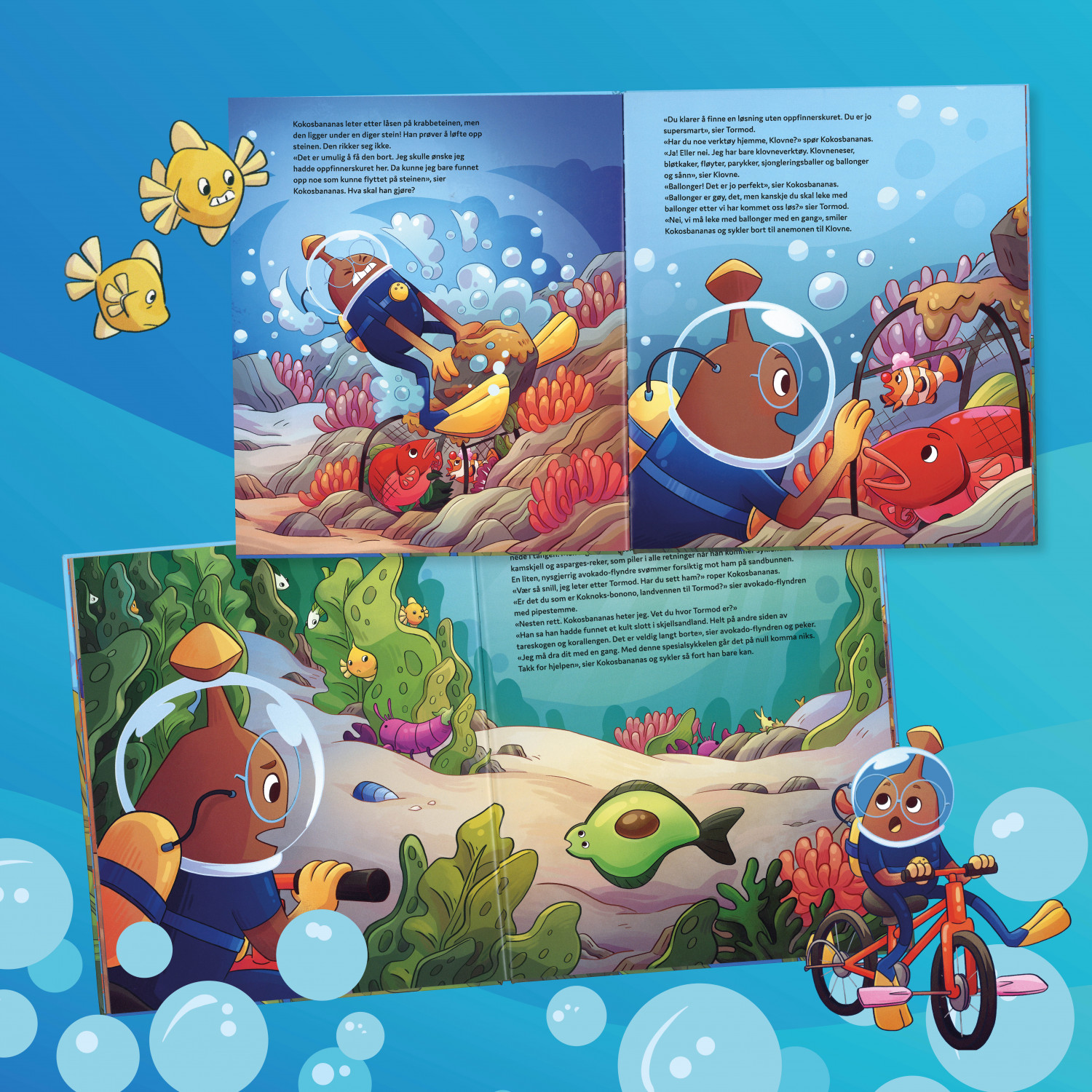 Kokosbananas elsker å leke med tomattorsken Tormod. Brød og stein er en av favorittlekene deres. Tomattorsken må gjette om det som blir kastet i vannet er tørre brødsmuler eller småstein. Men en dag dukker ikke Tormod opp, og Kokosbananas må ned i havet for å finne ut hva som er skjedd. Han lager en undervannssykkel i oppfinnerskuret sitt, og med den kan han sykle rundt på havbunnen for å lete. Vil han finne Tormod, mon tro? Gled deg til en fargesprakende undervannshistorie!