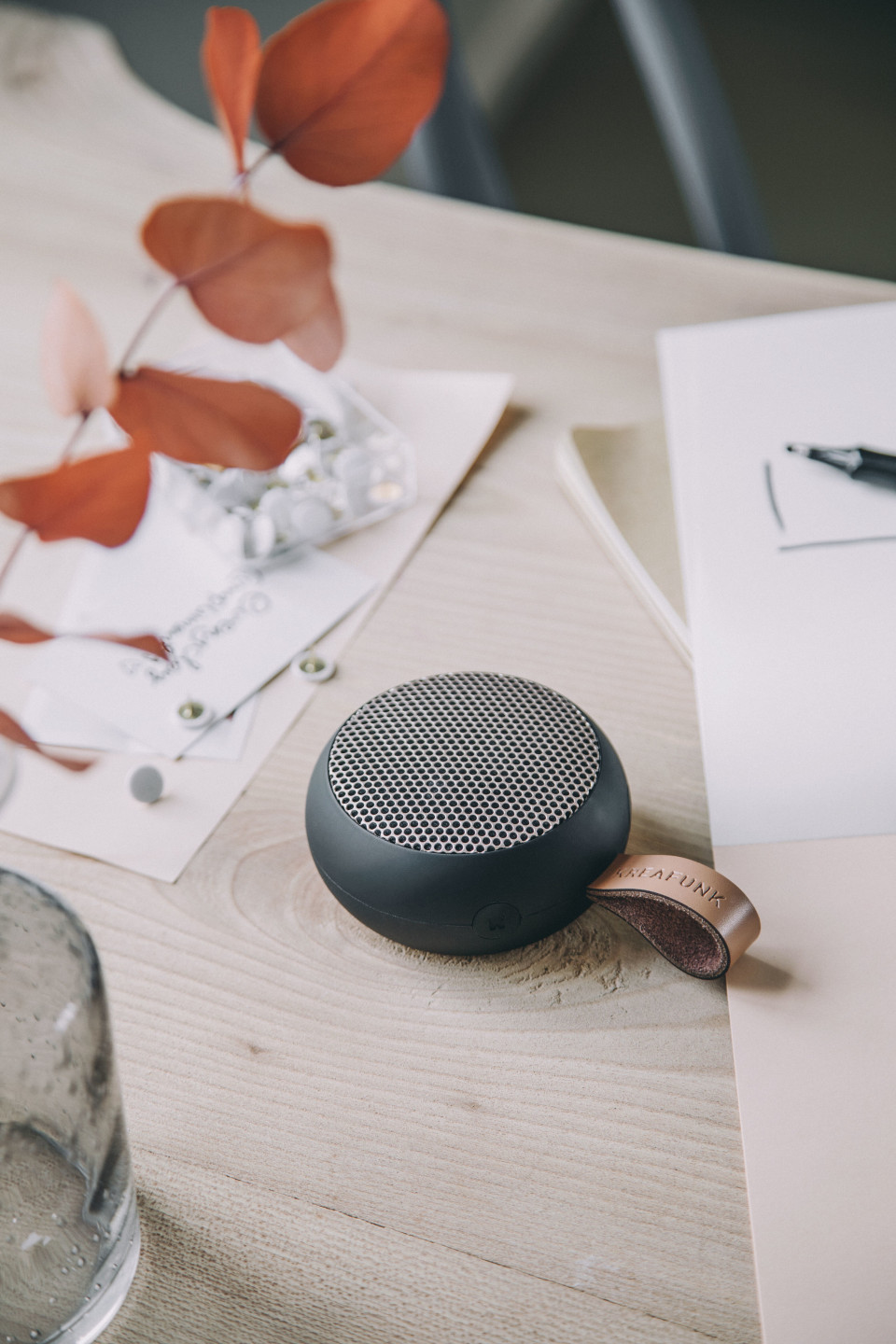 Liten bluetooth høyttaler aGO fra Kreafunk med stilig og praktisk skinnrem. Den lille størrelsen gjør den til det perfekte reisefølge!