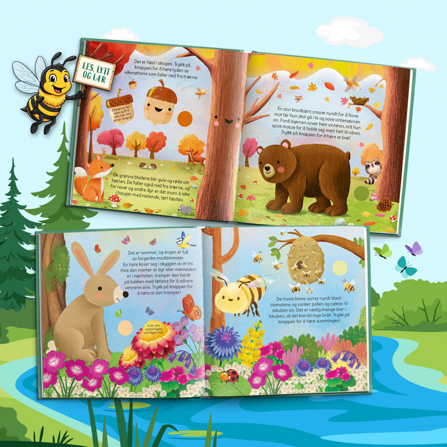Hvordan lyder en frosk? Hvordan høres en snøstorm ut? Bråker det i en bikube? Alt dette kan du sjekke ut og få vite mere om i denne søte boka. Den har solide sider i papp med en lyd på hver side og litt om hver enkelt årstid. La barnet se på illustrasjonene og trykke på lydknappene for å høre lydene som omgir oss i naturen.