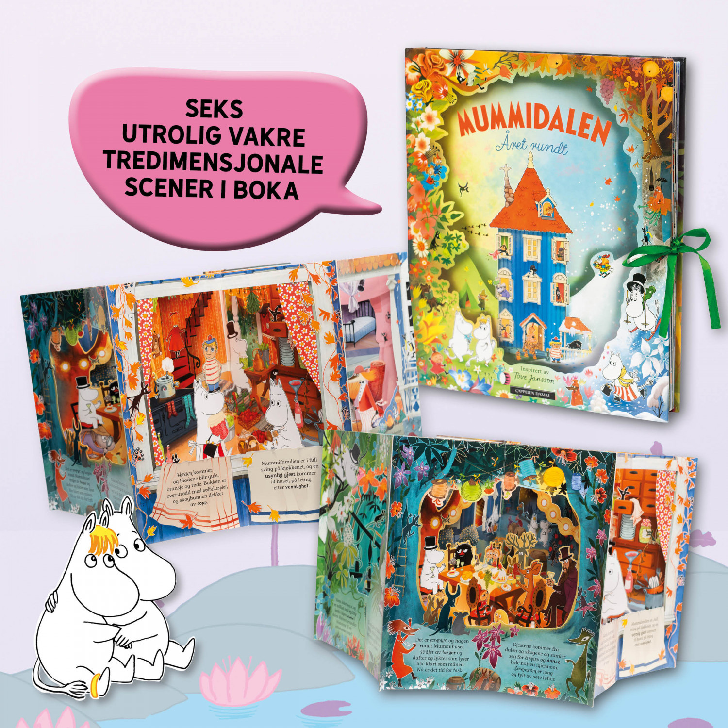 Følg årstidene sammen med Mummifamilien, fra de første vårblomstene stikker opp, gjennom den hete sommeren og til bladene faller og bakken dekkes av snø. Denne vakre karusellboken kan du folde ut og binde sammen. Les historien og bli med inn i Mummihuset, der døren alltid står åpen og alle er velkomne! Du finner seks utrolige vakre tredimensjonelle scener i boka. Virkelig et smykke av en bok. Gled deg til denne boka kommer hjem til deg!