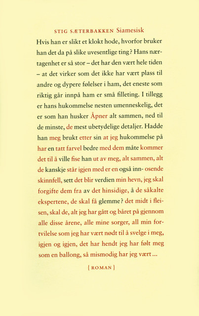 "Lyset hadde gått på badet da jeg kom inn dit i morges. Han hadde selvfølgelig ikke merket noe. Han satt i det stummende mørket og tygget tyggegummi som vanlig da jeg åpnet døren, lyset fra gangen falt på skrå inn i rommet og delte han i to - jeg kunne se ryggen av stolen og bakhodet hans, ikke noe mer - alt sølvpapiret glitret som om det var verdifullt, i en stille hvirvel rundt stolen."