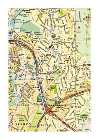 Ubrettet papirkart som gir sammenhengende oversikt over hele Oslo-området. Kartet dekker følgende områder: Fra Asker i vest til Vestli, Stovner og litt av Lørenskog i øst. Fra Frognerseteren, Lommedalen og Romsås i nord til Vollen, Nesodden og Kolbotn i sør. Nå med de nye motorveikryssnumrene som gjør det lettere for bilistene å finne riktig avkjøring. Nye E16 i Bærum og E6 ved Vinterbro er selvsagt med.