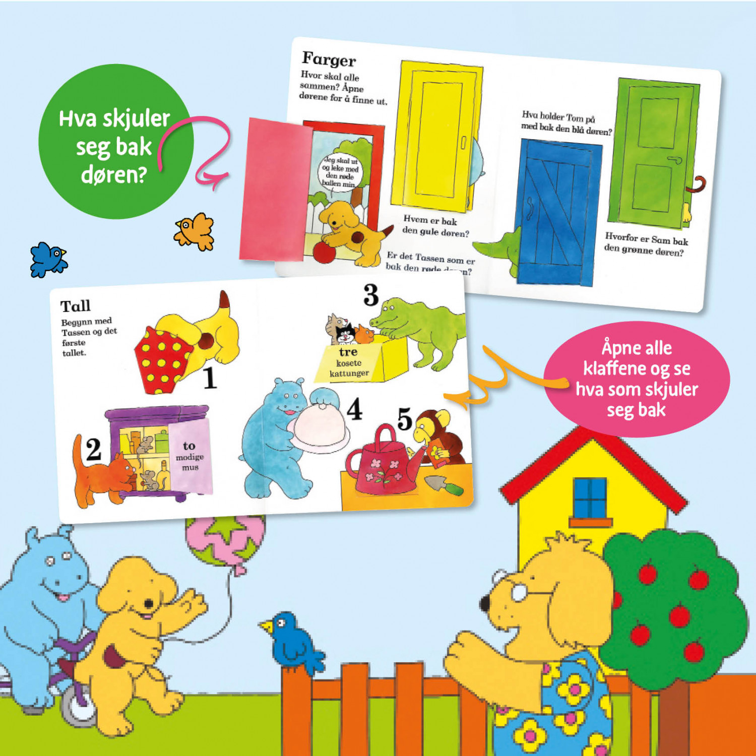 Tassen trenger hjelp. Det er så mye han skal lære her i verden! Først må han lære farger og finne ut hvilke dyr som skjuler seg bak klaffene, og hva er det de holder på med? Så må han lære forskjell på firkanter, rundinger og trekanter. Og kanskje det aller gøyeste - å lære å telle til 10. Løft på alle klaffene og bli med å telle du også! Store overraskelser venter under klaffene, som det er flere av på hver side. Dette er en lærerik bok i solid papp for de aller minste, en flott bok i stort format, som innbyr til både lesing og læring.