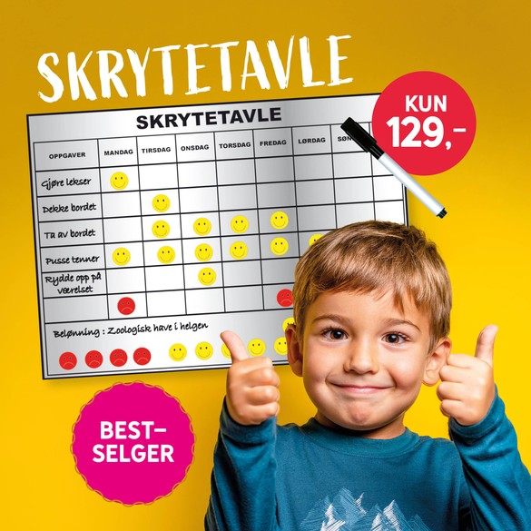 Alle barn trenger ros og bekreftelse på at de får til ting. Det gir bedre selvtillit og tro på at man kan mestre nye oppgaver. Vanker det i tillegg en liten belønning etter fullført oppgave blir det kanskje ekstra stas å bidra på hjemmefronten! Fyll inn ukens gjøremål på skrytetavla ved hjelp av tusjen som følger med!