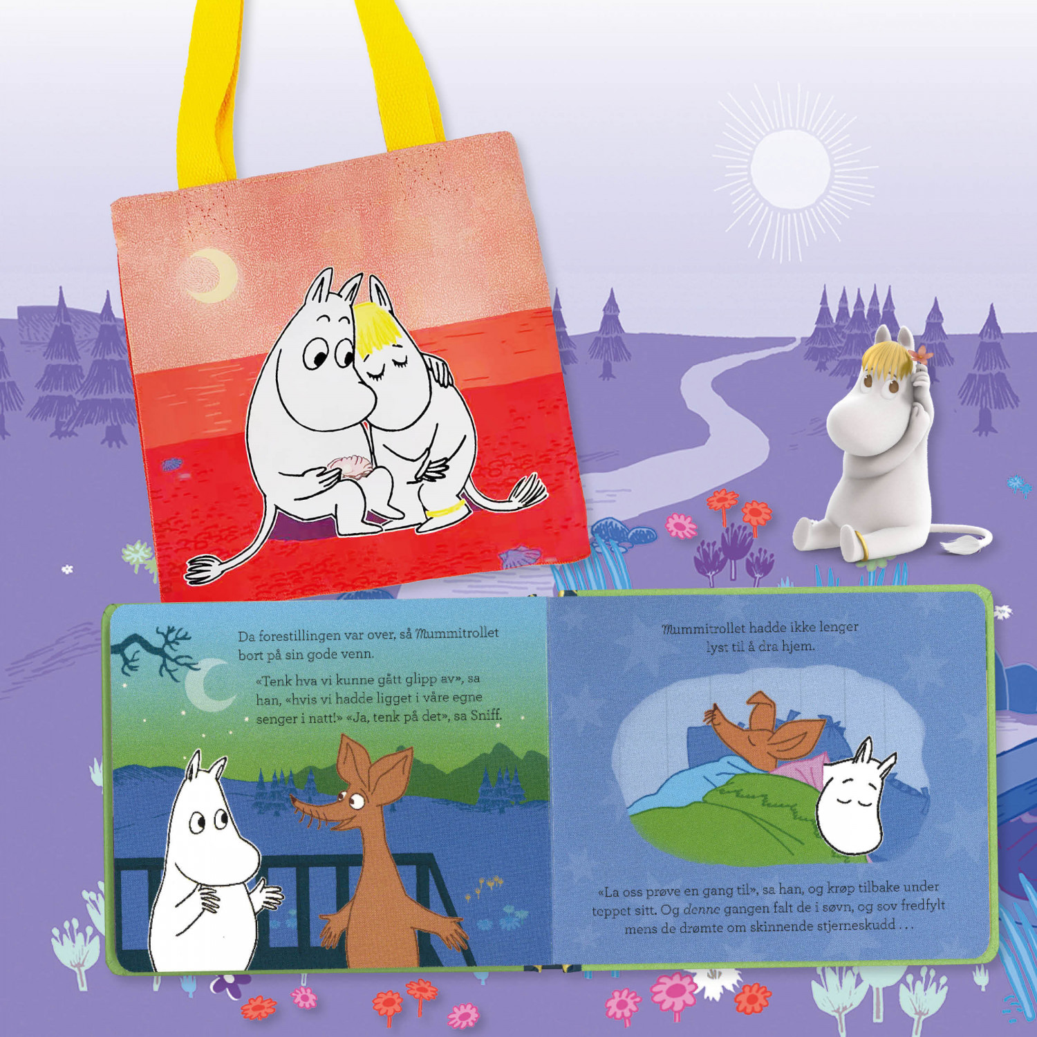 Tove Janssons bøker om Mummitrollet har sjarmert en hel verden, og Mummitrollet er en av barnas største favoritter. I denne vesle boka opplever to venner at noe nytt og fremmed kan bli til et spennende eventyr. Mummitrollet og Sniff skal overnatte borte for første gang. Men når natten kommer i tretopphytta, føles alt bare rart, og de lengter hjem. Men så skjer det noe på nattehimmelen … Boka passer akkurat oppi den søte vesken du får sammen med boka, eller kanskje kosedyr eller matboks?