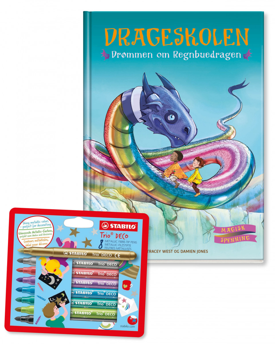 Kanskje du får lyst il å tegne en regnbuedrage? Her får du åtte tusj med metalliske farger som fungerer supert på både hvitt og farget papir. Den metalliske fiberspiss-pennen er perfekt til å fargelegge også store områder. Slipp kreativiteten løs!