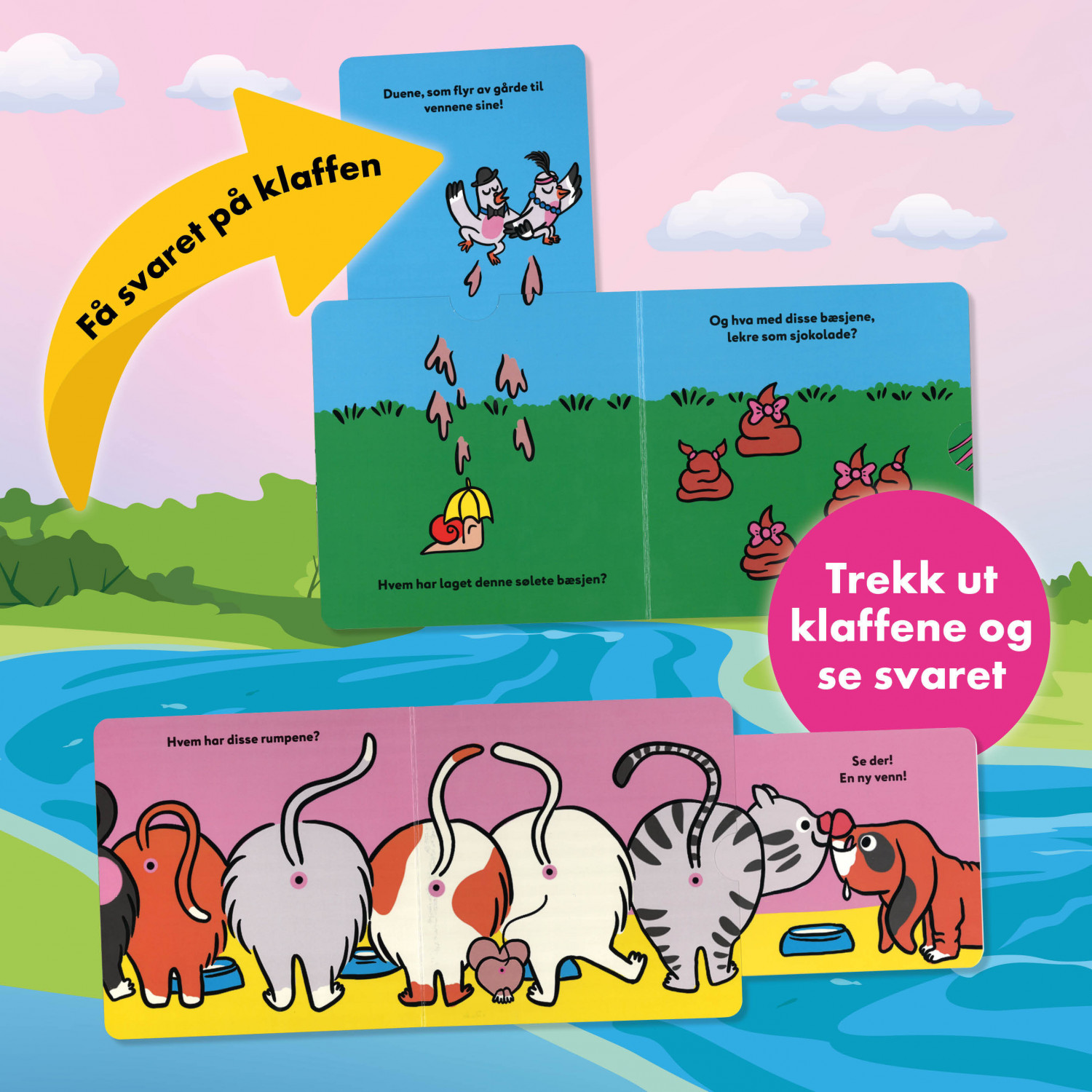 Her kommer to helt herlige, fargerike og morsomme bøker i solid papp til smårollingene. Bæsj og promp er jo alltid morsomt i en periode i småbarnstiden og her er det gjort med humor for små mennesker. På alle sidene er det store klaffer å dra i enten bortover eller oppover for å se hvem sin bæsj det er eller hvem sin rumpe det er. Gled dere til denne pakken kommer hjem til dere.